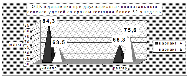Низкие величины ОЦК (менее 85,0 мл/кг) имели место в обоих вариантах (рис.4), однако при сепсисе А – лишь в период разгара, то есть позднее, чем при гиперэргическом варианте. Средние значения ОЦК в начале процесса достоверно ниже при варианте Б (р=0,034), в разгар процесса достоверно ниже при варианте А (р=0,05), то есть выраженный относительный дефицит ОЦК при сепсисе Б был непродолжительным. Степень дефицита ОЦК более 25% встречалась в 2 раза чаще при варианте А.