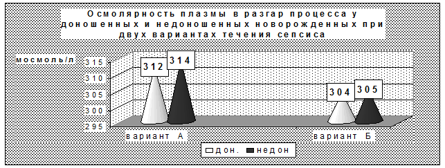 В разгар септического процесса при обоих вариантах отмечается гиперосмия, более выраженная при варианте А (см. рис.№ 5). Мы связываем это с катаболической направленностью обменных процессов, деструктивными изменениями в тканях, гипоксией и ацидозом. Гиперосмия, вызывая клеточную гипогидратацию, усиливает тяжесть неврологических расстройств при сепсисе.