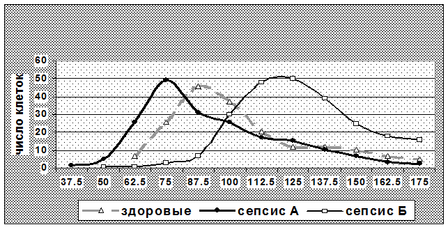 Смещение гистограммы распределения MCV в сторону микро - или макроцитоза позволяет дифференцировать клинико-лабораторные варианты неонатального сепсиса. Вся кривая распределения при варианте А смещена по отношению к гистограмме здорового влево, а при варианте Б – вправо.