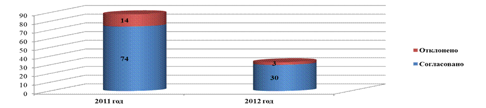 Снижение количества поступивших обращений объясняется следующим. В 2011г. от муниципальных заказчиков поступило 30 обращений о согласовании (в 2012г. – одно обращение), а также от департамента социальной защиты населения, опеки и попечительства по заказам на приобретение квартир для детей – сирот – 33 обращения (2012г. – 5 обращений).