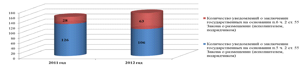 В отчетном периоде проведен анализ 169 уведомлений о заключении контрактов с единственным поставщиком (исполнителем, подрядчиком) на основании п.5, 6 ч.2 ст.55 Закона о размещении заказов (154 уведомления в 2011г.), что на 15 уведомлений больше (9,7%), чем за 2011г.
