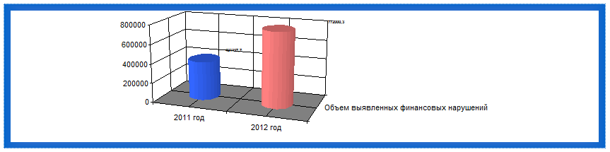 5. Анализ выявленных финансовых нарушений по видам нарушений показывает, что в сравнении с 2011 годом нарушений выявлено больше на 14172,6 тыс. руб. При этом в 2012 году на 1294,6 тыс. руб. (на 87%) уменьшился объем выявленного нецелевого использования бюджетных средств по сравнению с предыдущим годом, но увеличился объем выявленного неэффективного использования бюджетных средств на 14654,3 тыс. руб.(на 484%). Основной объем финансовых нарушений в сумме 17458,5 тыс. руб. или 88,4 % от общей суммы нарушений выявлен специалистами департамента здравоохранения Костромской области по внеплановым проверкам.