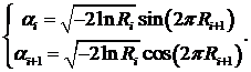 Применение метода обратного преобразования невозможно в силу того, что интеграл от данной функции не выражается конечной формулой. Один из наиболее распространенных способов построения датчика нормально распределенных чисел заключается в следующем: формируются две независимые случайные величины Ri и Ri+1. Тогда, по формулам 4, известным как преобразование Бокса-Мюллера, можно сформировать две независимые случайных величины, распределенных по нормальному закону с нулевым математическим ожиданием и единичной дисперсией.