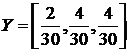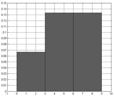 Дана выборка, объем которой равен десяти: 0, 7, 4, 9, 5, 4, 8, 5, 2, 7. Минимальный элемент выборки равен 0, максимальный – 9. Разобьем интервал [0,9] на три интервала: [0,3), [3,6) и (6,9]. Длины всех трех интервалов одинаковы и равны D1=D2=D3=3. Тогда в первый интервал попадут два элемента (0 и 2), во второй – четыре (4, 4, 5 и 5), в третий – четыре (7, 9, 8, и 7). Вектор Y при этом будет иметь следующий вид: