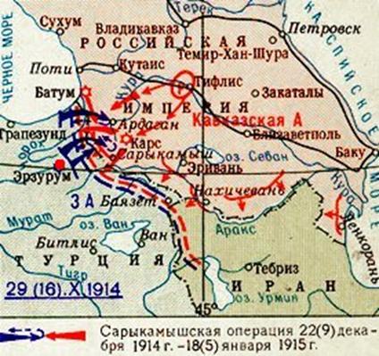 С 9(22) декабря 1914 г. по 5(18) января 1915 г., в тяжелых зимних условиях, на Кавказском фронте развернулись ожесточенные бои, известные под названием Сарикамышской операции. В начале инициатива была на стороне турок, которые почти вдвое численно превосходили русские войска. Турецкое командование, стремясь, во что бы то ни стало, овладеть Сарикамышом, не считалось с потерями