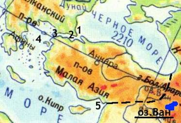 Малая Азия — полуостров на западе Азии. Омывается Чёрным, Мраморным, Эгейским и Средиземным морями и проливами Босфор и Дарданеллы, отделяющими Азию от Европы. Полуостров далеко по сравнению со всеми остальными частями Азии выдвинут на запад. Восточной границей Малой Азии как физико-географической зоны обычно считают линию от побережья Рис. 6