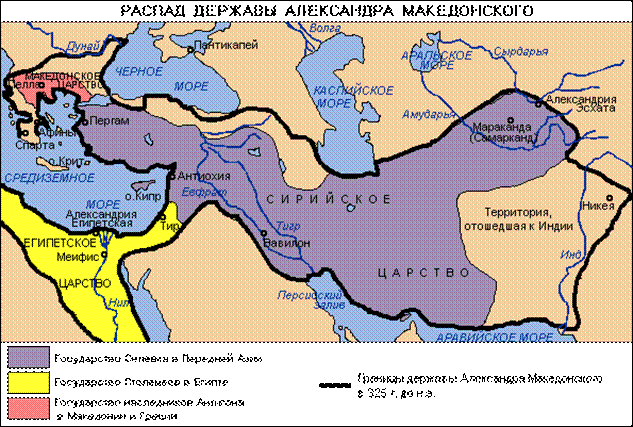 Обширная империя Александра просуществовала недолго. После смерти властиг. до н. э.) его удачливые полководцы выкроили из оставшегося наследства свои самостоятельные царства, из которых со временем выделились три основных — государство Птолемеев в Египте, государство наследников Антигона в Македонии и Греции, государство Селевка в Передней Азии (рис.10). Наиболее обширным из них было последнее; оно охватывало почти все азиатские завоевания Александра и представляло большую угрозу для образовавшихся в эти же времена в северной зоне Передней Азии менее могущественных государств: Понта, Каппадокии, Малой Армении, Иберии (Грузия), Великой Армении, Атропатены и других.