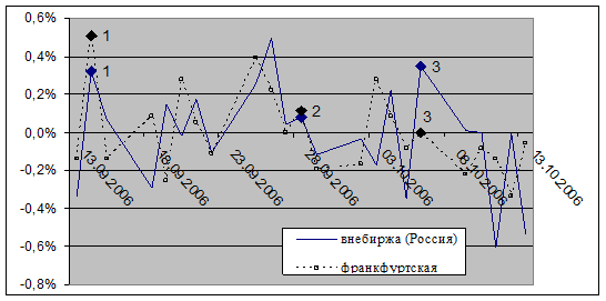 [4] ♦ на графике обозначены три упомянутые выше политические события: (1)- убийство Козлова (13.09.2006), (2) - арест российских военных в Грузии (27/09/2006), (3) - убийство журналистки Анны Политковской (7/10/2006)