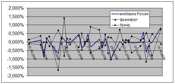 График 6. Изменение доходностей бренда и еврооблигаций на Франкфуртской бирже и на российской внебиржевом рынках за 01/09/2006-16/10/2006 гг.