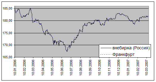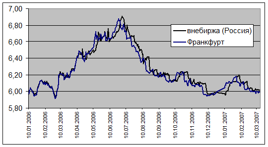 График 7. Изменение средних котировок на еврооблигацию на двух рынках с 10/01/2006 по 16/03/2007.