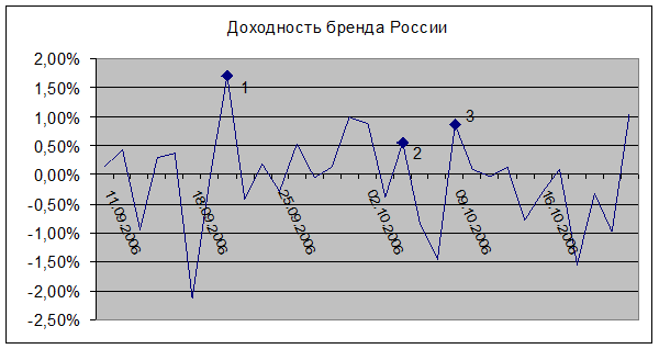 В течение исследуемого периода в стране произошло несколько событий, заметно повлиявших на ее бренд. При оценке реакции оказалось, что в случае громких происшествий, подробно освещаемых в иностранной прессе, реакция иностранцев не хаставляла себя ждать. Например, после убийства журналистки А. Политковской доходность бренда в течение недели оставалась отрицательной. Сильно доходность упала и одновременно с началом блокады Грузии, но по нашей оценке, ущерб от этого события носил временный характер. Примечательно, что реакция на «отрицательные» события носит более определенный и неизбежный характер, чем на «положительный».