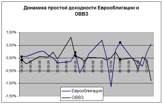 График 1. Динамика простой доходности еврооблигации Россия-20208 и ОВВЗ-2011 за 13/09/2006-13/10/2006.[2]