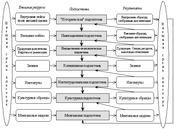 г) средовая структура, элементами которой являются среды, основную роль среди которых для промышленных кластеров играют профессиональные сообщества (инженерные, управленческие, маркетинговые, логистические объединения, сообщества потребителей и т. п.)[8], а также совокупности формальных и неформальных институтов, функционирующих в кластере.