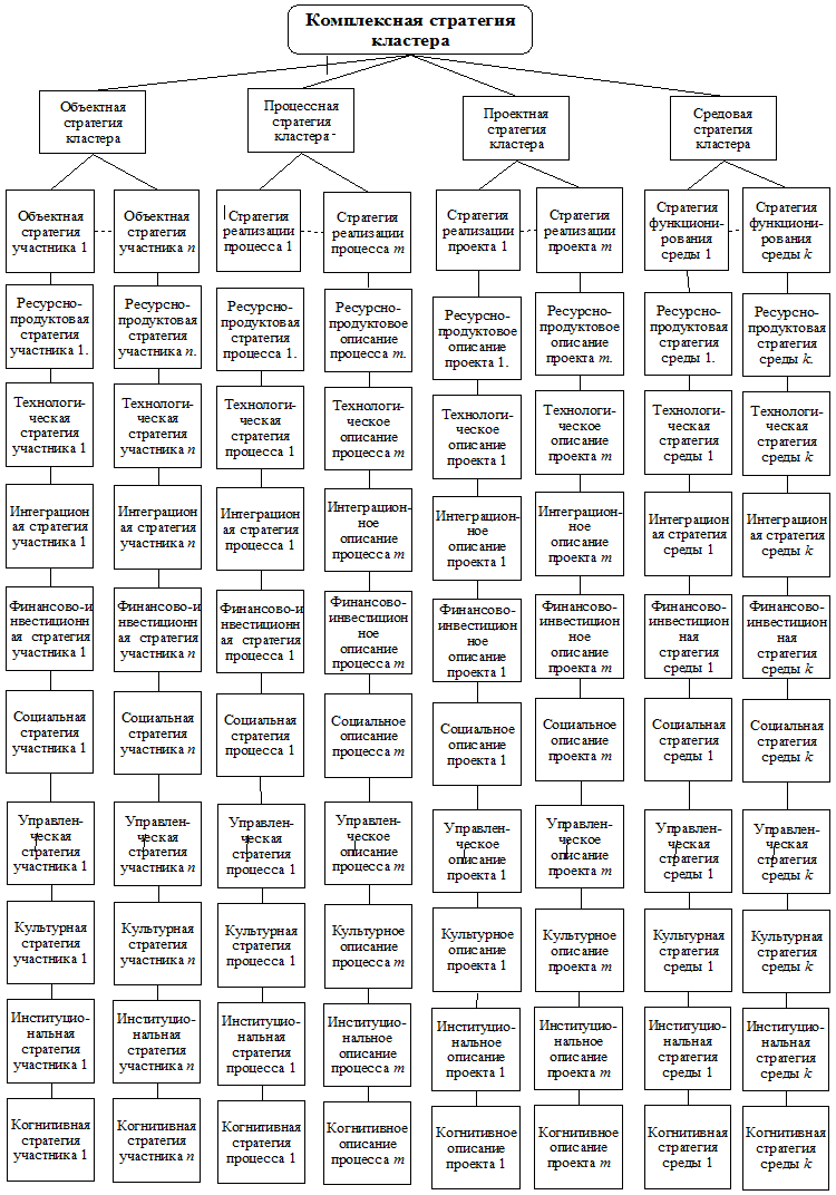 Учет предложенной классификации приводит к необходимости формирования стратегии кластера как комплекса из четырех типов стратегических документов а) стратегических планов входящих в кластер предприятий с учетом их всесторонних взаимосвязей (объектная стратегия кластера); б) стратегических планов развития и взаимосвязей процессов (процессная стратегия кластера); в) стратегического описания проектов (целевых программ), реализуемых участниками кластера (проектная стратегия кластера); г) стратегических планов функционирования и развития сообществ, сформированных из лиц, имеющих отношение к организациям кластера (средовая стратегия кластера). Создание такой комплексной стратегии представляет собой сложный полиструктурный и многофакторный процесс, включающий формирование, согласование и комплексирование точек зрения руководителей организаций – участников кластера и руководства кластера, представителей профессиональных сообществ работников организаций кластера, ответственных за проектную деятельность кластера и, наконец, представителей местных органов управления и власти.