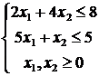 Пример решения задачи. Прибыль от реализации 1 т кефира составляет 2 млн руб., а от 1 т молока – 1 млн руб. Затраты рабочего времени на молоко 4 ч / т, а на кефир – 2 ч/т. Рабочий день – 8 часов. Расход сырья: 5 ед. на 1 т кефира и 1 ед. на 1 т молока. Всего имеется в запасе 5 ед. сырья. Составить такой план производства продукции, чтобы прибыль от ее реализации была максимальной.