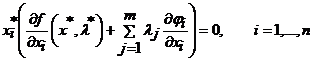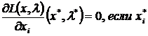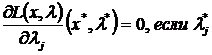 Необходимые условия экстремума для функции Лагранжа в случае дифференцируемости целевой функции и функций, определяющих ограничения задачи, состоят в равенстве нулю всех ее частных производных. Дифференцируя L(x, l) по всем переменным, получим следующие соотношения:
