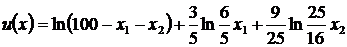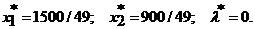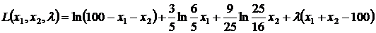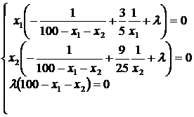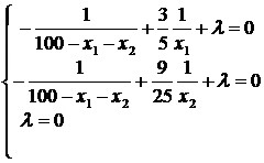 Заметим, что значения x1 = 0, x2 = 0 и 100 = x1 + x2 являются недопустимыми, так как в этих случаях не определена целевая функция. Условие 100 ¹ x1 + x2 влечет за собой l = 0 – третье условие системы дополняющей нежесткости. Следовательно, для нахождения решения достаточно решить систему: