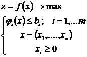 Пусть исходная задача (1.1) является формализованным представлением некоторой экономической ситуации. К задаче математического программирования приводят задачи, в которых требуется принять решение о выборе одной из допустимых альтернатив (планов), наилучшей в смысле некоторого критерия эффективности. Искомой альтернативе в задаче соответствуют переменные x. Функциональные зависимости между переменными описывают взаимодействия и взаимозависимости различных компонентов альтернативы выбора, а также представляют собой оценки затрат, необходимых для реализации той или иной альтернативы. Наличие каких-либо лимитов на ресурсы влечет за собой ограничения на выбор альтернативы. Для простоты будем считать, что все ограничения задачи (1.1) соответствуют лимитам на ресурсы, требующиеся для реализации выбираемой альтернативы.