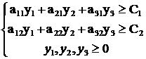 a11y1 + a21y2 + a31y3 ≥ C1. Аналогично для продукции P2: a12y1 + a22y2 + a32y3 ≥ C2. Также необходимо учесть, что цены на ресурсы (объективно обусловленные оценки) не могут быть отрицательными.