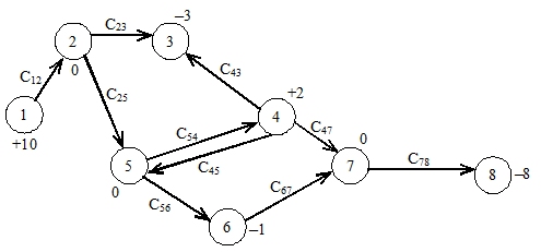 Компания имеет восемь крупных оптовых складов. Отдел сбыта принял решение значительно снизить цену одного дорогостоящего изделия с целью ликвидации образовавшегося запаса этих изделий. Руководство намерено разместить имеющиеся в наличии запасы на указанных восьми складах в соответствии с прогнозами сбыта в этих районах. Таким образом, надо перераспределить некоторую часть запасов. Числа у складов – это избыток или недостаток товара. Склады 2, 4, 5, 6, 7 – промежуточные. Все другие склады – источники, если избыток товаров и стоки – если требуется дополнительный запас. Сij – затраты на перевозку одного изделия со склада i на склад j.