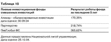 Ну, вот все и встало на свои места. Как мы видим, паевые фонды акций более доходны, чем паевые фонды смешанных инвестиций, а последние более доходны, чем паевые фонды облигаций. То же самое мы увидим и на отрезке в пять лет: лучшие фонды акций опережают смешанные фонды и фонды облигаций. Сравните для этого табл. 9 с табл. 10. И чем больше срок, тем больше доходность паевых фондов акций по отношению к фондам других категорий. Но, как мы помним, фонды акций очень рискованны на коротких отрезках времени, чего не скажешь о паевых фондах смешанных инвестиций и облигаций.