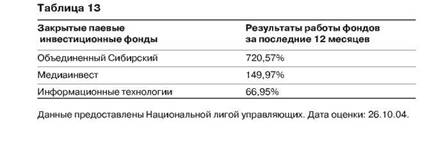К третьему типу мы можем отнести закрытые паевые инвестиционные фонды. Собирая пул инвесторов на этапе формирования фонда, закрытый паевой фонд оговаривает срок возврата инвестиций заранее. То есть в течение определенного периода времени, например 5 лет, инвестор фонда не имеет право погасить свои паи и забрать проинвестированные деньги. Имея еще меньше ограничений, чем интервальные паевые фонды, управляющие компании закрытых паевых фондов имеют более широкие инвестиционные возможности и, соответственно, меньшие ограничения в структуре активов фонда. Поэтому прибыль у закрытых фондов зачастую довольно большая, хотя никаких обязательств фонд перед пайщиками, естественно, не берет. Закрытые паевые инвестиционные фонды имеют возможность работать на рынке недвижимости, безусловно, это открывает инвесторам новые возможности инвестиционного рынка России. Но, к сожалению, вход на этапе формирования закрытого фонда обычно исчисляется миллионами, что не позволяет инвесторам с небольшим капиталом участвовать в его работе. Закрытых фондов в России еще не так уж и много, история их работы невелика, но уже сегодня можно с уверенностью говорить о том, что у закрытых паевых фондов большое будущее. Результаты работы некоторых закрытых фондов приводят многих в восторг (табл. 13).