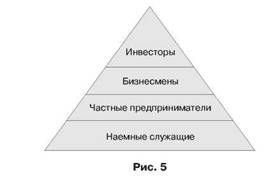 На следующей ступеньке находятся те, кто работает на себя, - частные предприниматели. Больший уровень ответственности привлекает к себе меньшее количество людей. Разумеется, частные предприниматели гораздо больше рискуют, вкладывают и, что естественно, больше зарабатывают.