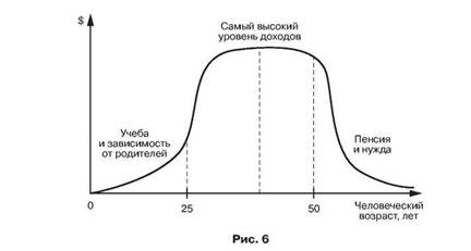 Первый и третий периоды мы можем назвать пассивными. В первом периоде (с момента рождения и в среднем до 20-25 лет) мы еще не имеем возможности получать стабильно высокий доход, находясь на попечении родителей и государства. А вот в третьем периоде (начинается в среднем в 55-60 лет) мы уже не можем получать стабильно высокий доход, и он, естественно, падает. По статистике, большая часть населения в этом возрасте выходит на пенсию, а доход, как мы знаем, пенсия приносит довольно маленький. Именно поэтому два упомянутых периода мы и отнесем к пассивным.