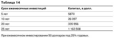 Первый принцип, который мы с вами рассмотрим, - это время, или срок, инвестиций. Для успеха нашей стратегии, основанной на инвестировании в акции и облигации через паевые инвестиционные фонды, время является самым важным фактором. Время снижает влияние риска на наши инвестиции до минимума. Но кроме этого время в инвестировании творит огромные чудеса. Давайте рассмотрим примеры того, как время увеличивает капитал даже с небольшими суммами инвестиций. Это хорошо видно в табл. 14.