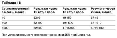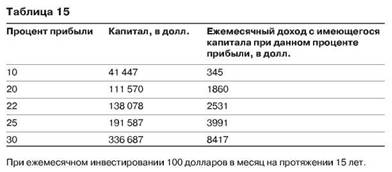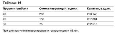 Разница в 5% приводит к разнице в 5000 долларов ежемесячного дохода через 15 лет при одном и том же проинвестированном капитале. Правда и в том, что 20%, 25% и 30% прибыли в год - это достаточно хороший результат работы фонда. Могу вас заверить, что процент прибыли намного важнее суммы, которую вы готовы инвестировать. Посмотрите на табл. 16, здесь показаны различные суммы инвестиций с разными процентными ставками прибыли.