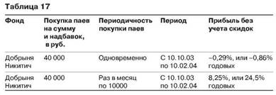 Приобретая паи инвестиционных фондов ежемесячно, мы получаем возможность покупать их не только в те моменты, когда рынок взлетает, но и тогда, когда рынок идет вниз. Ежемесячное инвестирование, основанное на методе усреднения, - это неотъемлемая часть нашей стратегии, которая предоставляет возможность получать дополнительную часть прибыли. Это хорошо видно в табл. 17.