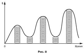 Мне кажется, еще лучше рынок сравнивать с пружиной, которая в момент спада при различных обстоятельствах, причем неважно каких, сжимается. Но ничто не может ее удержать в таком состоянии, и она обязательно, разогнувшись, выстрелит с размахом, и рынок возьмет свое с лихвой. Затем динамика утихает, пружина сжимается, и весь процесс повторяет свой цикл вновь и вновь. Это хорошо видно на рис. 8. Безусловно, это примитивный вид объяснения работы фондового рынка. И нельзя утверждать, что рынок будет расти всегда. Рос? Да! Будет расти? Этого сказать не может никто. Но то, что метод усреднения является лучшим методом покупки инструментов на волатильном рынке России, можно утверждать с уверенностью.