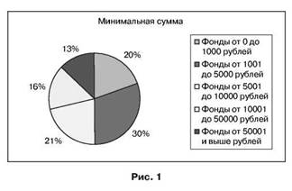 Доступность для мелких и средних инвесторов отличает паевые фонды от многих других форм капиталовложения. Прежде всего, я имею в виду минимальный стартовый капитал, с которым можно прийти в управляющую компанию для приобретения паев фонда. Разброс предложений достаточно большой - от 0 до нескольких миллионов рублей. Но все же в среднем эта цифра примерно равна 5000 рублям, являясь доступной для мелких, а тем более и средних инвесторов. На рис. 1 показаны в процентном отношении от общего количества паевые фонды с различными требованиями к стартовому капиталу. Ну а повторное приобретение в большинстве фондов чаще всего ограничено минимальной суммой в одну тысячу рублей, что позволяет создавать универсальные инвестиционные стратегии как с большим, так и с малым капиталом.