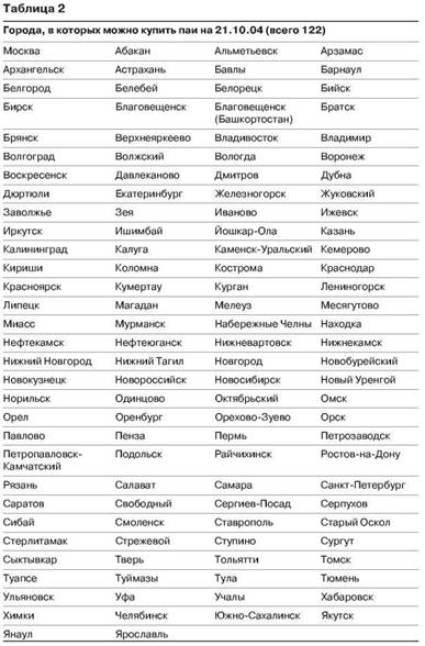 Купить или продать паи можно как в управляющей компании паевого фонда, так и у агентов паевого фонда. На конец 2004 года паи фондов можно приобрести более чем в 120 городах России. Агентские сети управляющих компаний все дальше и дальше проникают в регионы, предоставляя при этом больше возможностей для частных инвесторов в регионах. Для того чтобы приобретать паи фонда, необязательно постоянно приезжать в управляющую компанию или к ее агенту. Оформив многоразовую заявку, вы можете приобретать паи данного фонда, перечисляя деньги через любой банк из любой точки России. Давайте посмотрим, в каких городах на сегодняшний день можно приобрести и продать паи инвестиционных фондов (табл. 2).