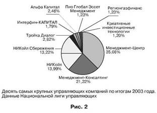 Если мы посмотрим на долю всех активов на рынке коллективных инвестиций в России, то увидим, что 85,37% из них находятся в управлении пяти самых крупных управляющих компаний. Хотя тенденция эта меняется, управляющих компаний становится больше, а доля активов первых пяти становится меньше. Например, по итогам 1999 года доля первых пяти управляющих компаний от всех активов составляла 95,8%. Уверен, что эта тенденция продолжится в основном за счет прихода на рынок коллективных инвестиций большего числа частных инвесторов, а также благодаря появлению новых управляющих компаний в регионах. На рис. 2 показано 10 самых крупных управляющих компаний.
