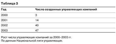 Если мы разберем примеры с фондами, имеющими задачу следовать за рынком, немного обыграть депозитные вклады в банках или помочь уберечь сбережения от инфляции, то придем к тому же самому выводу: искусство управления активами дано не всем. Одна из задач этой книги - разработать инвестиционный портфель, основываясь только на паевых инвестиционных фондах, в основном на тех, которые будет обыгрывать рынок год за годом. Критерии отбора фондов и их управляющих компаний помогут нам выбрать для инвестиций те фонды и их управляющие компании, которые достигают поставленных целей не только для себя, но и для нас, инвесторов. Научиться это делать необходимо еще и потому, что рост числа управляющих компаний так же велик, как и рост всего рынка (табл. 3).