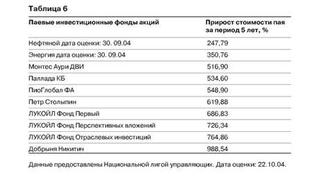 Паевые инвестиционные фонды акций являются полной противоположностью фондам облигаций, конечно, если мы говорим о задачах, степени риска и доходности. По этим признакам они уступают только венчурным фондам. Инвестируя деньги вкладчиков в акции предприятий Российской Федерации, фонды акций являются очень рискованными для капиталовложений на короткий промежуток времени. Но если мы с вами посмотрим на результаты работы паевых фондов акций на отрезках от 10 лет и более, то увидим, что чаще всего они дают стабильно хороший результат. Рынку паевых инвестиционных фондов в России всего 8 лет. Да и до 2002 года количество фондов было небольшим. Поэтому мои выводы сделаны на основе результатов работы взаимных фондов США и Европы. В нашем же случае за основу результатов работы паевых фондов можно брать период в 5 лет. Десять паевых фондов акций, работающих более 5 лет, показывают вполне приемлемый результат (табл. 6).