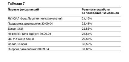 Вот вам пример - инвестиционная стратегия одного открытого паевого инвестиционного фонда акций: стратегией инвестирования фонда является активное управление портфелем ликвидных акций («голубых фишек») российских предприятий. Цель - получение дохода, превышающего уровень доходности рынка акций при среднем уровне риска. В инвестиционный портфель включаются ценные бумаги, имеющие высокий потенциал роста1. Посмотрев на результаты работы этого фонда, можно сказать, что выполнение поставленной задачи фонду удается. За период его работы с 24 октября 2003 года по 24 октября 2004 года доходность инвестиций составила 28,61%, а индекс Московской межбанковской валютной биржи (ММВБ), как отражение рынка акций, за тот же период дал доход в 10,45%, индекс фондовой биржи РТС составил -0,09%.