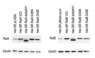 Het-SR RalA V23 | Het-SR RalA deltaN11 | Het-SR RalA D49N | Het-SR RalA D49E | Het-SR RalB V23 | Het-SR RalB deltaN11 | Het-SR RalB D49N | Het-SR RalB D49E | |