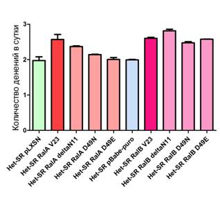 Одной из основных характеристик трансформированных клеток является повышенная скорость деления. По литературным данным известно, что белки Ral могут влиять на пролиферацию клеток, в частности увеличивая экспрессию CyclinD1 или подавляя активность ингибитора клеточного цикла p27kip. При исследовании влияния активных форм RalA и RalB на пролиферацию клеток линии Het-SR оказалось, что они в значительной степени ускоряют скорость деления (см. рисунок 3). Более того, анализ данных по динамике пролиферации клеток, экспрессировавших эффекторные мутанты белков Ral, показал, что взаимодействие RalA с комплексом экзоциста, а также с белком RalBP1 является необходимым условием для RalA-зависимой стимуляции деления клеток (эффекторные мутанты RalA D49E и RalA D49N не оказывали влияния на скорость деления). Взаимодействие RalA с PLD, скорее всего, вносит определенный вклад в ускорение деления клеток, однако он не столь значителен. Необходимо отметить, что в современной научной литературе есть данные, указывающие на возможное влияние активности RalBP1 на пролиферацию.