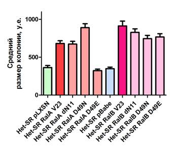Тест на формирование колоний при отсутствии микроокружения (тест на колониеобразование) отражает способность клеток пролиферировать без «поддержки» соседних клеток (см. Рисунок 4). Оказалось, что практически все исследованные линии обладают этой способностью, что говорит о большой степени их автономности от микроокружения. Только клеточная линия Het-SR RalA D49E, в которой нарушено взаимодействие RalA с комплексом экзоциста, не отличается по этой характеристике от контроля. Учитывая то, что нами не выявлено отличий этой линии по скорости пролиферации в условиях стандартного культивирования от линии Het-SR pLXSN, можно сделать вывод, что взаимодействие RalA c экзоцистом играет важную роль в пролиферации клеток как в условиях бедного микроокружения, так и при стандартной культивации.