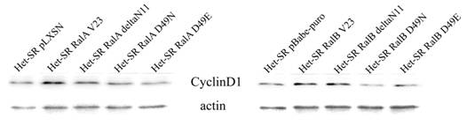 В ходе работы был поставлен вопрос, опосредована ли Ral-зависимая стимуляция пролиферации усилением экспрессии CyclinD1. Как видно из рисунка 5 активные формы Ral действительно усиливают экспрессию этого гена. Однако в нашей модели RalB-опосредованная активация RalBP1 скорее всего играет важную роль в усилении экспрессии CyclinD1, так как лишь эффекторный мутант с нарушенным взаимодействием между этими белками (RalB D49N) не отличался от контроля. Нами не было выявлено достоверных отличий в количестве CyclinD1 в клеточных линиях с экзогенной экспрессией эффекторных мутантов RalA по сравнению с контролем.