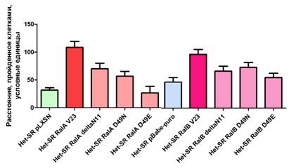 При исследовании подвижности клеток с заблокированным митозом (с помощью Митомицина С) в тесте на «зарастание раны in vitro» оказалось, что RalB лишь немного ускоряет движение клеток, тогда как клетки линии Het-SR RalA V23 мигрируют в «рану» в 3 раза быстрее, чем контрольные. Более того, интересно, что эффекторные мутанты RalA D49N (эта форма лишь немного ускоряла движение клеток) и RalA D49E (совершенно неотличима от контроля) не влияли на подвижность клеток, что указывает на значимость взаимодействия этой малой ГТФазы c RalBP1 и, в особенности, с экзоцистом в этом процессе (см. рисунок 6). Таким образом, представляется, что RalA играет существенную роль в стимуляции миграционной активности клеток в данной модельной системе, и что эта функция малой ГТФазы осуществляется, скорее всего, через взаимодействие с комплексом экзоциста.