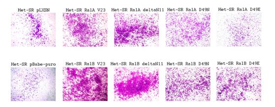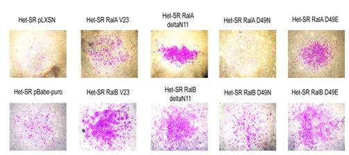 С другой стороны, клеточная линия Het-SR RalA D49N также не отличалась по скорости пролиферации от Het-SR pLXSN в стандартных условиях, в то время как в тесте на образование колоний она формировала большие по площади фокусы роста. Таким образом, можно предположить, что взаимодействие RalA с RalBP1 не влияет на рост клеток в таком тесте, но необходимо для ускоренного роста в стандартных условиях. Активные формы RalB, также как и эффекторные мутанты этой ГТФазы, стимулировали колониеобразование в данном эксперименте.