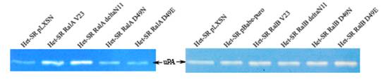 Исследование активности одной из таких секретируемых протеаз, Урогиназа-подобный активатор плазминогена (uPA), в кондиционированных средах от полученных клеточных линий выявило интересную закономерность. Активная форма RalA приводит к некоторому увеличению уровня секреции этой протеазы (см. рисунок 9). В клеточных линиях, экспрессировавших эффекторные мутанты RalA D49N и D49E, как и в RalB-трансфектантах, секреция uPA не повышалась, что говорит о ключевой роли взаимодействия RalA с RalBP1 и с комплексом экзоциста в стимуляции активности этой протеазы.