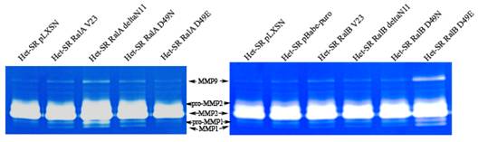 Показано, что MMP (матриксные металлопротеазы) влияют на прогрессию опухолевых заболеваний в целом, и на метастазирование в частности. Исследования уровня секреции матриксных металлопротеаз, обладающих желатиназной активностью, показало, что в кондиционированных средах от клеточных линий-производных Het-SR наиболее активной протеазой является MMP2 (см. рисунок 10). При этом было выявлено слабое усиление активности ММP9 и MMP1 при экспрессии активной формы RalA, неспособной взаимодействовать с PLD. В то же время эффекторный мутант RalB D49E значимо изменил внеклеточную активность этих протеаз, что говорит о сложности и неоднозначности Ral-зависимой регуляции секреции MMP и о различиях в необходимых партнерах для этого процесса.