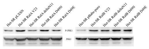 Влияние белков Ral на внутриклеточную передачу сигнала неоспоримо. Исследование влияния экспрессии различных форм белков Ral на активацию белковых каскадов в клетках Het-SR показало, что фосфорилирование по 183 тирозину киназы JNK1 (MAPK8) повышено в клеточных линиях с активными формами белков Ral (см. рисунок 11). Эффекторные мутанты RalA deltaN11 и RalA D49E не обладали способностью стимулировать активацию JNK1, в то время как все эффекторные мутанты RalB не отличались от исходной полностью активной формы по этому параметру. Таким образом, можно сделать вывод о том, что для подавления стимуляции JNK1 недостаточно блокирования взаимодействия RalB с одним из трех исследованных белков-партнеров, в то время как взаимодействие RalA с PLD и комплексом экзоциста являются необходимыми условиями для RalA-зависимой активации этой киназы. Нами также выявлено некоторое влияние белков Ral на активацию Stat3 и p38, но не ERK ½ (данные не приведены).
