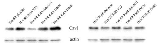 Cav-1 экспрессируется в исследованных линиях на очень высоком уровне. В клеточных линиях Het-SR, несущих эффекторные мутанты RalA deltaN11, RalB V23, RalB D49N и RalB D49E наблюдается слабовыраженное снижение экспрессии этого белка. Некоторое повышение его экспрессии отмечено в линии с активной формой RalA, а также в клетках с заблокированным взаимодействием RalA с комплексом экзоциста (см рисунок 12).