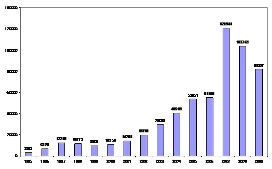 В интенсификации инвестиционных процессов в России иностранные инвестиции не сыграли решающей роли, хотя и характеризовались выраженной тенденцией к росту на протяжении почти всего периода статистических наблюдений (с 1995 г.), за исключением кризисных и гг. (рис.1).