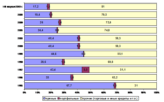 В связи с высокими темпами инфляции в начальный период реформ оценить динамику доли иностранных инвестиций в экономику России возможно лишь за последнее десятилетие. С 2000 г. по 2003 г. эта доля упала с 11,5% до 4,1%, а затем вновь несколько выросла, составив в 2004 г. 6,9%, в 2005 г. – 8,2%, в 2006 г. – 7,8%, в 2007 г. – 7,1%, в 2008 г. – 7,5%, уменьшившись в кризисном 2009 г. до 6,0%. Однако на всем протяжении периода реформ отчетливо прослеживается тенденция к уменьшению доли прямых инвестиций при увеличении поступлений в виде торговых и иных кредитов (рис.2).